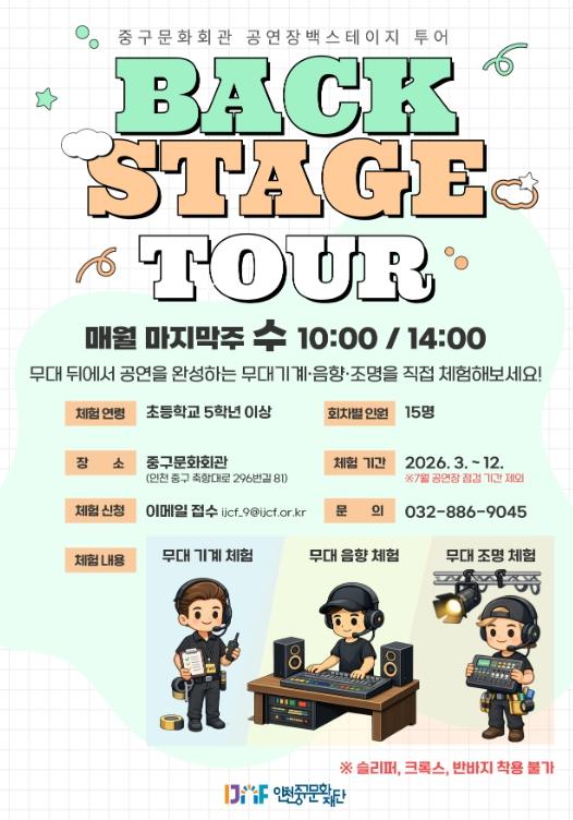 (재)인천중구문화재단은 시민들이 평소 접하기 어려운 공연장 무대 뒤 공간을 직접 체험할 수 있는 ‘2026년도 상반기 중구문화회관 백스테이지 투어’를 운영한다고 5일 밝혔다.