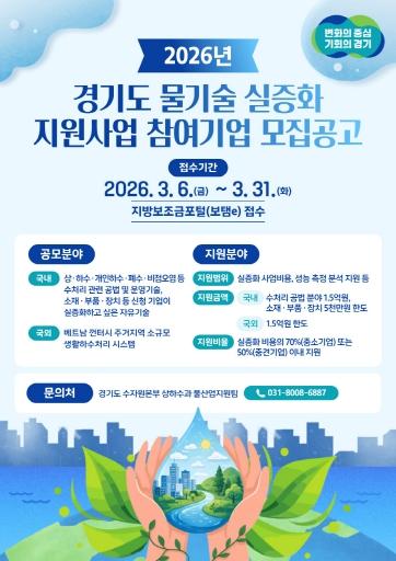 경기도가 ‘2026년 경기도 물기술 실증화 지원사업’ 참여 기업을 공개 모집한다.
