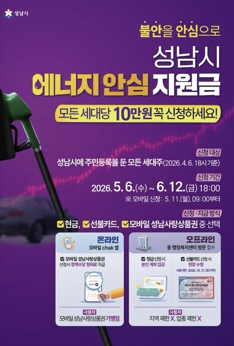 신상진 성남시장은 “자원안보 위기 상황에서 에너지 가격 상승으로 시민들이 체감하는 물가 부담이 매우 큰 상황”이라며 “이번 지원금이 가계 부담을 덜어주는 데 도움이 되기를 기대하며, 신속하고 공정하게 지급될 수 있도록 행정 역량을 집중하겠다”고 말했다.