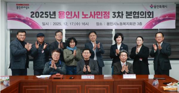 용인특례시는 17일 용인시노동복지회관에서 제3차 노사민정협의회 본협의회와 2025년 노사민정협의회 성과보고회를 열었다고 밝혔다.이날 협의회엔 노사민정협의회 위원장인 이상일 시장과 노사민정협의회