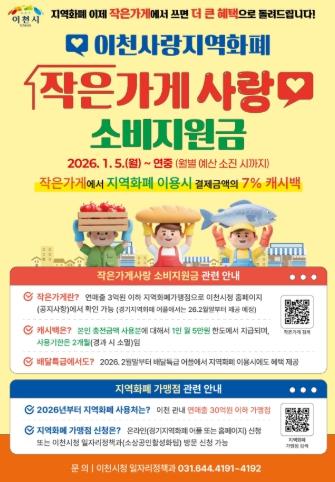 이천시는 2026년부터 이천사랑지역화폐 가맹점 연매출 기준을 기존 12억 원 이하에서 30억 원 이하로 확대하고, 연매출 3억 원 이하 소상공인을 대상으로 한 ‘작은가게사랑 소비지원금’ 사업을 본격 추진