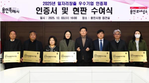 용인특례시는 3일 본관 4층 전겹실에서 일자리 창출에 힘쓴 지역 우수기업 8곳에 인증서와 현판을 수여했다.이번에 선정된 기업은 ▲아산디앤씨 주식회사 ▲일승푸드 제2공장 ▲주식회사 에이치에스씨 ▲㈜