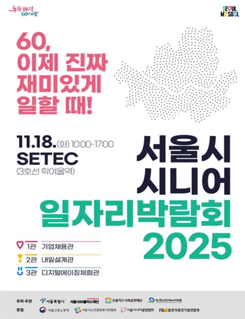 서울시는 오는 11월 18일 SETEC(강남구)에서 '서울시 시니어 일자리박람회 2025'를 개최한다. 초고령사회 대응 종합대책 ‘9988 서울 프로젝트’의 하나로 마련된 이번 박람회에서는 시니어들이 쌓아온 경력