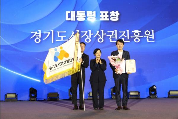 경기도시장상권진흥원이 중소벤처기업부 주최로 열린 ‘제21회 전국우수시장박람회’ 시상식에서 전통시장·상점가 활성화 공로를 인정받아 대통령 표창을 수상했다. 17일 청주오스코에서 열린 ‘전국우수시