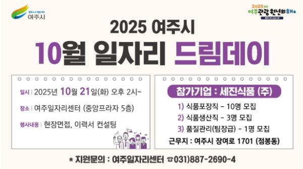 여주시는 오는 10월 21일 오후 2시 여주일자리센터(세종로 14번길 18, 중앙프라자 5층)에서 ‘2025년 10월 일자리드림데이’를 연다. 이번 행사에서는 식품 제조업체 세진식품(주)이 참여해 식품 포장직 10