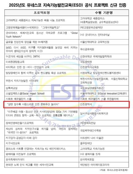 인천광역시는 지난 3년간 문화유산 도보탐방 사업의 일환으로 추진해 온 ‘알면 알수록 사랑스러운 인천 문화유산 놀이터’ 프로그램이 2025년 유네스코 지속가능발전교육(ESD) 프로젝트 신규 인증을 받았다