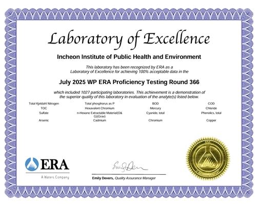 인천시 보건환경연구원, 2025년 국제숙련도 평가 ‘최우수 등급’획득