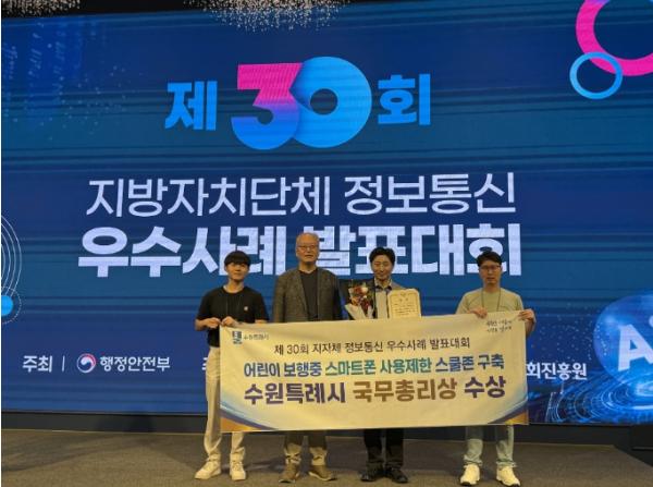수원시가 행정안전부 주관 ‘제30회 지자체 정보통신 우수사례 발표대회’에서 ‘어린이 보행 중 스마트폰 사용 제한 스쿨존 구축’으로 국무총리상(우수상)을 받았다. 발표대회는 18~19일 울산광역시 타니
