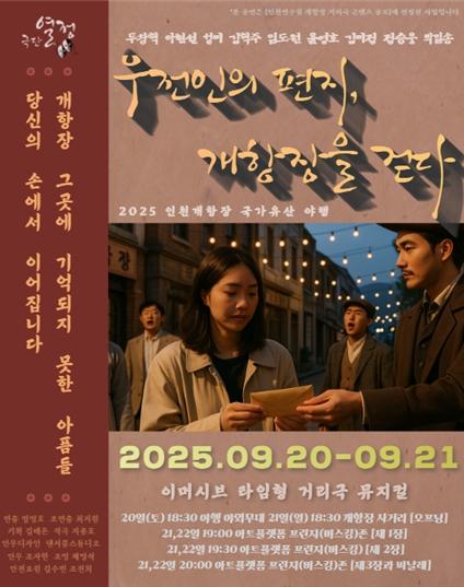 뮤지컬 '우전인의 편지, 개항장을 걷다'가 오는 2025년 9월 20일~21일 ≪2025 인천 개항장 국가유산 야행≫ 기간 중 개항장 일대에서 다시 선보인다. 지난 6월 초연 당시 높은 관심과 호응을 얻었던 이 작품