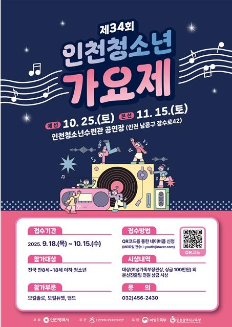 인천시설공단은 청소년들의 음악적 열정과 끼를 발산하고 건전한 청소년 문화를 조성하고자 '제34회 인천청소년 가요제'의 참가자 모집을 내달 15일까지 진행한다. 참가 자격은 음악을 좋아하고 노래에 소질