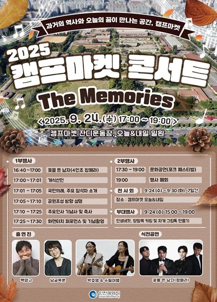 인천광역시는 오는 9월 24일 오후 5시, 부평 캠프마켓 개방공간인 잔디운동장에서 ‘2025 캠프마켓 콘서트 The Memories’를 개최한다고 밝혔다. 이번 행사는 캠프마켓이 지닌 역사성과 장소성을 문화예술