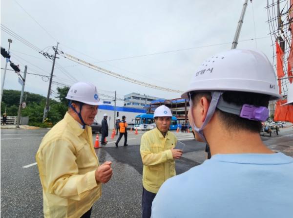 최대호 안양시장이 16일 발생한 비계 전도사고 현장에 방문해 신속한 사고 수습과 안전조치를 지시했다.안양시에 따르면, 이날 오후 2시 5분경 만안구 안양7동 명학대교 인근의 건물 신축공사 현장에서 비계