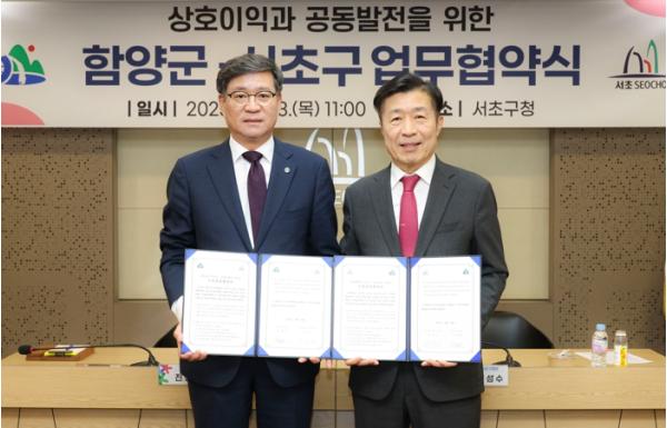 서울 서초구는 지난 23일 서초구청에서 경상남도 함양군과 업무협약(MOU)를 체결했다고 밝혔다.협약식에는 전성수 서초구청장과 진병영 함양군수를 비롯한 양 기관 주요 관계자들이 참석해 화기애애한 분위