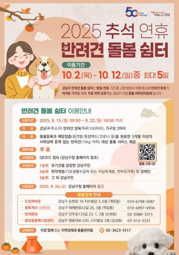 꿈이 모이는 도시, 미래를 그리는 강남구가 추석 연휴를 앞두고 구민들의 반려견 돌봄 부담을 덜기 위해 ‘반려견 돌봄 쉼터’를 운영한다. 신청은 9월 15일부터 22일까지 받으며, 선정된 반려견은 10월 2일