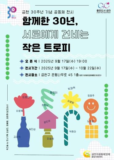 금천구는 개청 30주년을 맞아 17일부터 금천구공동체경제통합지원센터에서 특별 기념전시 ‘함께한 30년, 서로에게 건네는 작은 트로피’를 연다고 밝혔다.10월 22일까지 진행되는 이번 전시는 주민 작가 13