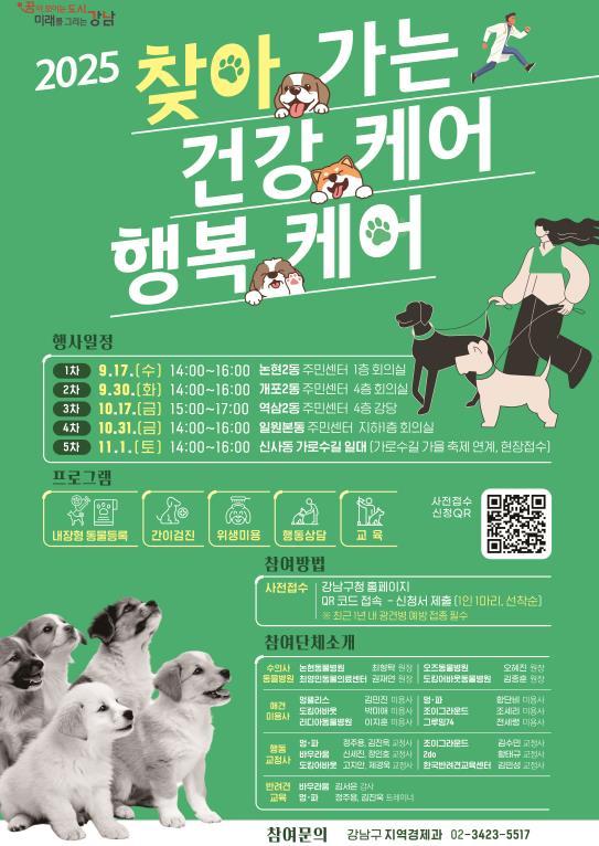 꿈이 모이는 도시, 미래를 그리는 강남구가 반려동물과 사람이 함께 사는 건강한 도시를 만들기 위해, 9월부터 11월까지 ‘찾아가는 건강케어 행복케어’ 반려견 복지 서비스를 운영한다.9월 17일 오후 2시