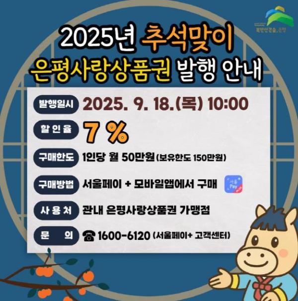 서울 은평구는 다가오는 추석을 맞아 오는 18일 10시부터 총 90억 원 규모의 ‘은평사랑상품권’을 발행한다고 밝혔다.이번 상품권은 서울페이플러스(+) 모바일 앱을 통해 7% 할인된 금액으로 구매할 수 있
