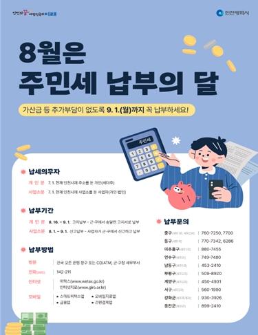 인천광역시는 8월 주민세(개인분: 약 112만 건, 140억 원) 납부의 달을 맞아 납부 대상자들에게 기한 내 신고ㆍ납부를 당부했다. 올해 7월 1일을 기준으로 인천시에 주소를 둔 세대주는 8월 16일부터 9월 1