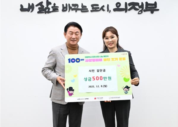 의정부시는 12월 8일 시장실에서 북한이탈주민 지원을 위한 현금 지정기탁금 전달식을 진행했다. 전달식에서는 시민 이홍국 씨와 북한이탈주민 김단금 씨가 함께 뜻을 모아 관내 북한이탈주민을 돕기 위한