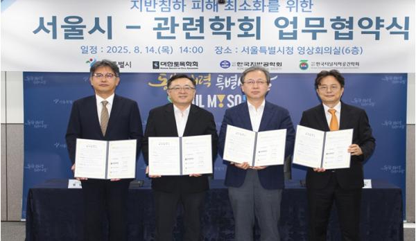 서울시는 14일 오후 2시 서울시청에서 지반 안전 관련 전문 학회 3곳과 ‘지반침하 예방 및 대응을 위한 업무협약’을 체결했다. 이날 협약을 체결한 전문 학회는 ▴대한토목학회(1951년 창립) ▴한국지반공