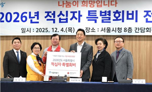 오세훈 서울시장은 4일 오후 2시 서울시청(8층 간담회장)에서 열린 ‘2026 적십자 서울지사 특별회비 전달식’에 참석해 권영규 대한적십자사 서울지사 회장에게 성금을 전달했다. 전달식은 ‘2026년도 적십