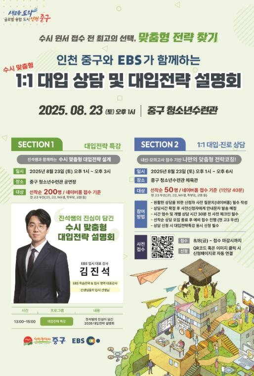 인천시 중구는 2026년도 대학 수시모집을 앞두고 ‘EBS와 함께하는 2025년 입시설명회’를 오는 23일 중구 청소년수련관에서 개최한다. 입시 전문가를 초청해 진행되는 이번 입시설명회는 청소년들이 2026