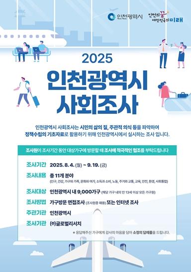 인천광역시는 오는 8월 4일부터 9월 19일까지 시민 삶의 질과 지역 사회 전반의 현황을 파악하기 위한 ‘2025년 인천사회지표조사’를 실시한다고 밝혔다.이번 조사는 시민의 생활 현황과 주관적 인식을 종