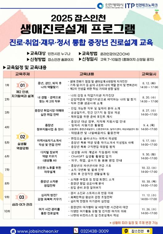 인천테크노파크(인천TP)가 운영하는 인천시 일자리 카페 ‘잡스(Job’s)인천’에서 중장년층의 인생 재설계를 돕기 위해 ‘생애진로설계 프로그램’을 운영한다. 이 프로그램은 8월 12일부터 총 10회에 걸쳐