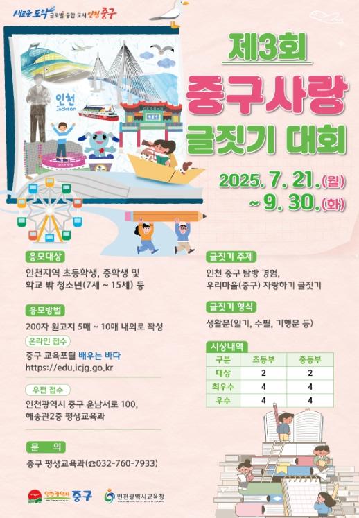 인천시 중구는 지역 청소년들을 대상으로 ‘제3회 중구 사랑 글짓기 대회’를 개최한다. 이번 대회는 청소년들에게 인천 중구의 자연·문화·역사 등을 탐방한 후, 이를 토대로 글짓기를 함으로써, 지역에 대