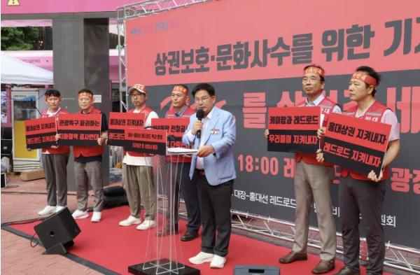 박강수 마포구청장은 7월 31일 오후 6시, ‘레드로드 R2’에서 열린 ‘대장-홍대선 레드로드 역사 설치 반대 비상대책위원회 기자회견’ 현장을 찾아, 대장-홍대선 종착역인 111정거장의 위치 변경을 강하게
