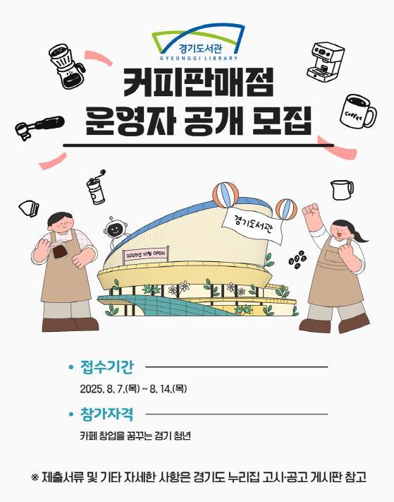 경기도가 오는 10월 개관을 앞둔 경기도서관 내 커피 판매점의 운영자를 모집한다. 대상은 카페 창업을 꿈꾸는 경기 청년이며, 신청 기간은 8월 7일부터 14일까지다.운영 기간은 계약일로부터 1년이며, 최대