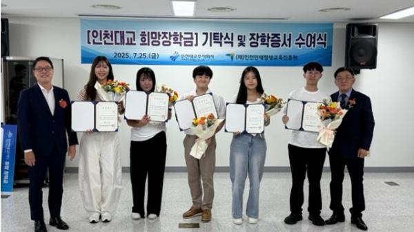(재)인천인재평생교육진흥원과 인천대교(주)는 지난 25일 ‘2025년도 인천대교 희망 장학금 기탁식 및 장학증서 수여식’을 개최했다고 밝혔다. 이날 행사에는 진흥원 이윤호 원장과 인천대교 박종혁 대