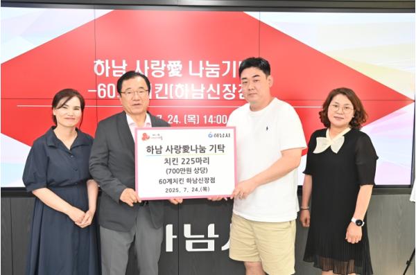 지난 24일 60계치킨 하남신장점(대표 김현성)은 하남시 13개 지역아동센터 아동들을 위해 치킨 225마리를 기부하며 기탁식을 진행했다.이날 기탁식에는 이현재 하남시장을 비롯하여 60계치킨 하남신장점 김