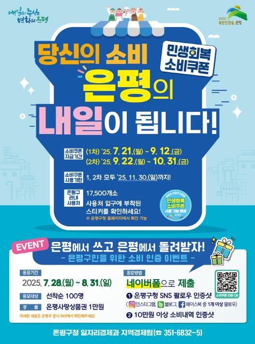 서울 은평구는 지역 내 소비를 촉진하고 소상공인을 응원하기 위한 ‘민생회복 소비쿠폰 관내 사용 인증 이벤트’를 오는 28일부터 진행한다고 밝혔다.이번 이벤트는 은평구 공식 SNS 중 1곳 이상을 팔로우
