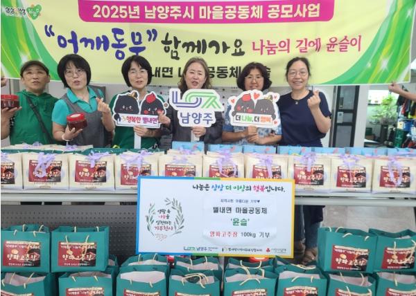 남양주시는 별내면이 18일 지역 나눔공동체 ‘윤슬’에서 관내 어려운 이웃을 위해 양파고추장 100kg을 기탁했다고 밝혔다. 이번 나눔은 지역 내 소외된 이웃을 위해 주민들이 자발적으로 마련한 것으로, 윤