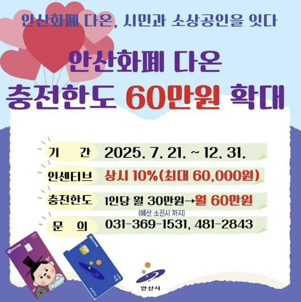 안산시는 오는 21일부터 지역화폐인 안산 화폐 ‘다온’의 월 충전 한도를 기존 30만 원에서 60만 원으로 두 배 상향 조정한다고 18일 밝혔다.앞서 시는 지난 2월부터 민생경제 회복을 위해 인센티브 지급률