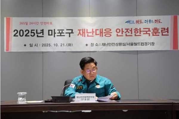 마포구는 10월 21일 오후 2시, 재난안전상황실과 서울월드컵경기장 서문 일대에서 ‘2025년 재난대응 안전한국훈련’을 실시했다. 이번 훈련은 재난안전대책본부의 역할과 기능을 점검하고, 기관 간 공조체