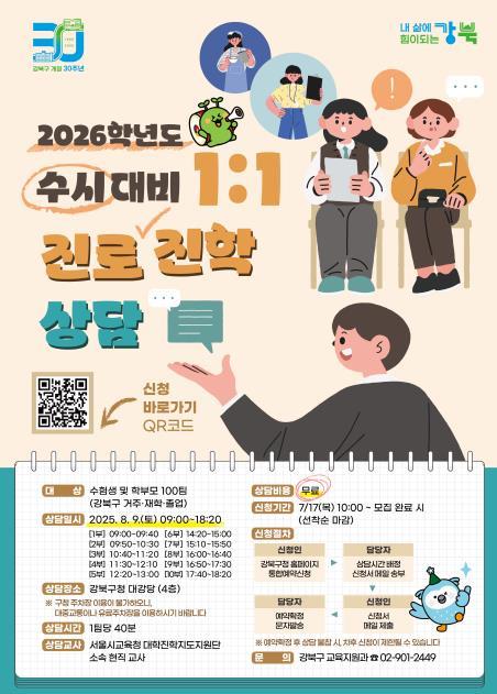 서울 강북구는 수험생들의 성공적인 대입 전략 수립을 돕기 위해 오는 8월 9일(토) ‘2026학년도 수시 대비 1:1 진로진학상담’을 운영한다.‘1:1 진로진학상담’은 강북구에 거주하거나 관내 학교에 재학