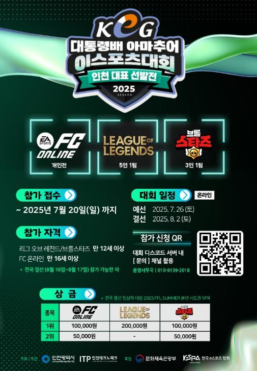 인천테크노파크(인천TP)와 인천시는 ‘제17회 대통령배 아마추어 e스포츠 대회의 인천 대표 선발전을 개최하며, 오는 20일까지 참가자를 모집한다고 밝혔다. KeG는 문화체육관광부가 주최하고 한국e스포츠협