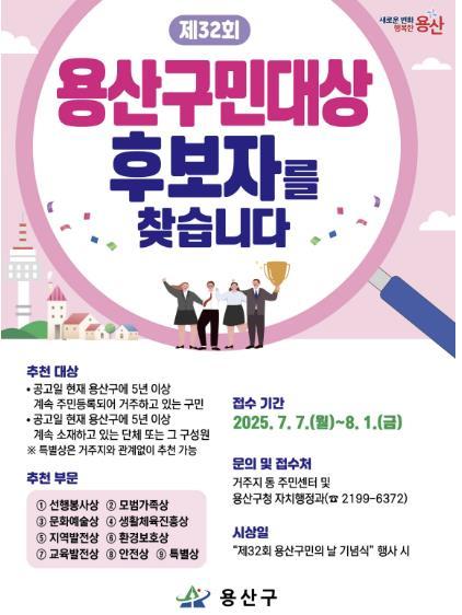 서울 용산구가 오는 8월 1일까지 ‘제32회 용산구민대상’ 후보자 추천을 받는다. 시상식은 10월 ‘용산구민의 날’ 기념식에서 거행될 예정이다.‘용산구민대상’은 지역사회 발전과 구민들을 위해 묵묵히