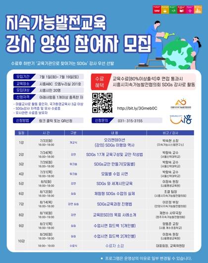 시흥시지속가능발전협의회는 오는 7월 22일부터 8월 26일까지 진행되는 '지속가능발전교육 강사 양성과정'에 참여할 시민을 7월 19일까지 모집한다.이번 교육은 지속가능개발목표에 대한 이해를 바탕으로,