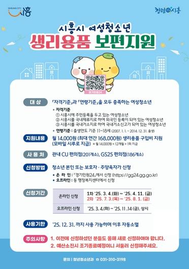 시흥시는 ‘2025년도 시흥시 여성청소년 생리용품 보편지원사업’의 온라인 신청을 8월 1일까지 받는다고 밝혔다.이번 사업은 여성청소년의 건강권과 인권 증진을 위해 생리용품 구매비용을 지원하는 것으로