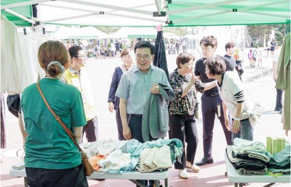 진교훈 서울 강서구청장이 5일 서울 낮 최고기온이 30도를 넘는 찜통더위에도 지역 곳곳을 다니며 주민과의 소통 행보를 이어갔다.진 구청장은 방화근린공원에서 열린 ‘금토벼룩시장’에 참석해 판매 부스