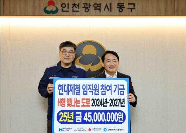 인천 동구는 지난 23일 현대제철 인천공장이 ‘H형 빛나는 도로’ 사업 조성기금 4천500만원을 전달했다고 밝혔다. 기금은 현대제철 인천공장 임직원들이 자발적으로 모금한 금액이다. 이날 기금 전달식에는