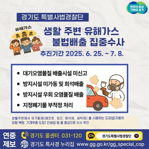 경기도는 6월 25일부터 7월 8일까지 생활주변(주거지역, 상업지역, 계획관리지역)에서 유기용제(페인트, 잉크, 희석제, 세척제 등)를 사용하는 도장업 및 인쇄업을 중심으로 ‘유해가스 불법배출 집중수사’