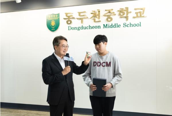 김동연 경기도지사가 16일 동두천중학교를 찾아 노점 할머니께 비상금을 건넨 선행으로 화제가 된 옥현일 군에게 표창을 수여했다.김 지사는 학교 현관에서 학생회와 함께 ‘함께라서 더 빛나는 우리’ 생명
