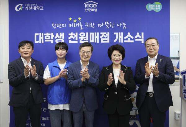 3일 문을 연 가천대학교 천원매점 일일 점원에 나선 김동연 경기도지사가 대학생들과 매점 음식을 나누며 기후위기 등 다양한 주제를 가지고 소통했다.경기도는 고물가로 늘어난 대학생 생활비 부담을 실질