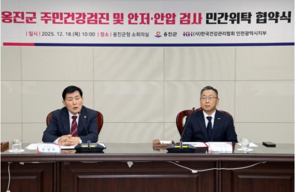 옹진군은 12월 18일 한국건강관리협회 인천광역시지부와 ‘옹진군 주민 건강검진 및 안저·안압 검사 위·수탁 협약’을 체결하고, 주민 대상 종합건강검진 사업을 본격 추진한다.이번 협약을 통해 한국건강관