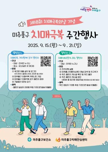 미추홀구 치매안심센터(센터장 차남희)는 제18회 치매 극복의 날을 맞아 오는 15일부터 7일간 ‘치매 극복 주간 행사’를 진행한다.이번 행사는 온라인 챌린지 2가지로 진행된다. 첫 번째는 모바일 걷기 플