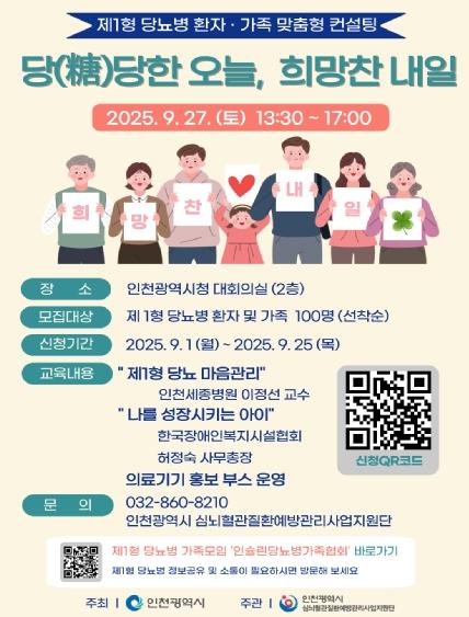 인천광역시는 9월 27일 오후 1시 30분부터 5시까지 인천시청 2층 대회의실에서 ‘제1형 당뇨병 환자ㆍ가족 맞춤형 컨설팅’을 개최한다고 밝혔다. 이번 행사는 ‘당당한 오늘, 희망찬 내일’이라는 주제로